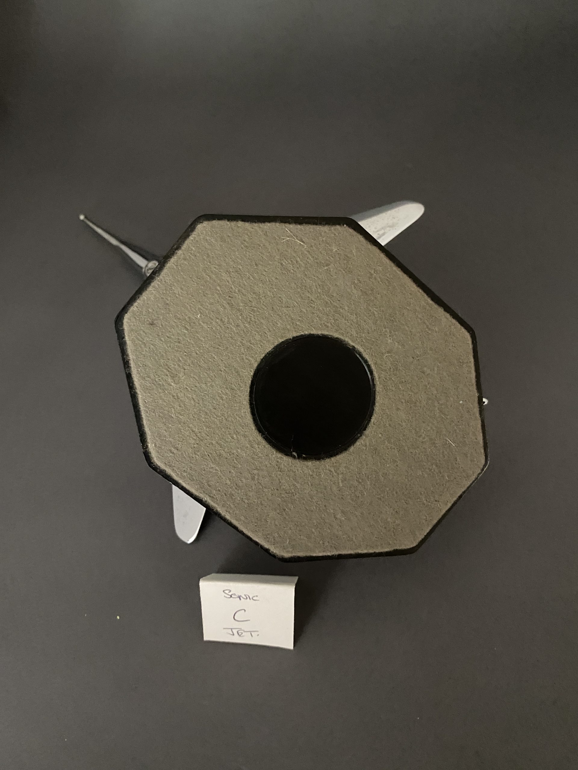 Chrome shaped base, sitting on black Bakelite base